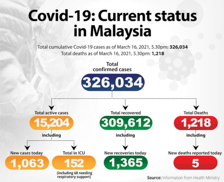Today, March 16, 2021, health experts in Malaysia report that they recorded 1,063 new Covid-19 cases. On March 15, 2021, there were just 1,208 new cases, fueling the speculation that Malaysia is experiencing a slow decline in cases.