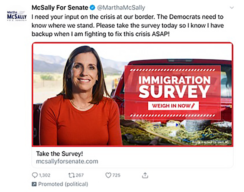 Senator McSally recently ran this “Promoted (political)” survey stating, “I need your input on the crisis at the border.”